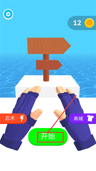1、进入界面后,可先查看【忍术】与【商城】功能,点击绿色的【开始】按钮开启关卡挑战,右上角显示当前持有【12】金币。