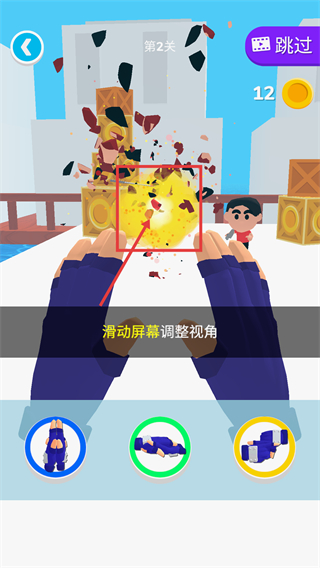 3、在【第2关】中,调整视角后瞄准宝箱触发击碎操作获取奖励,通过操作按钮维持节奏推进当前关卡进程。
