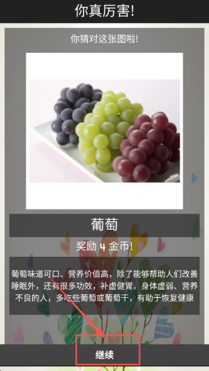4、领取奖励:在你真厉害!葡萄界面点击继续领金币。