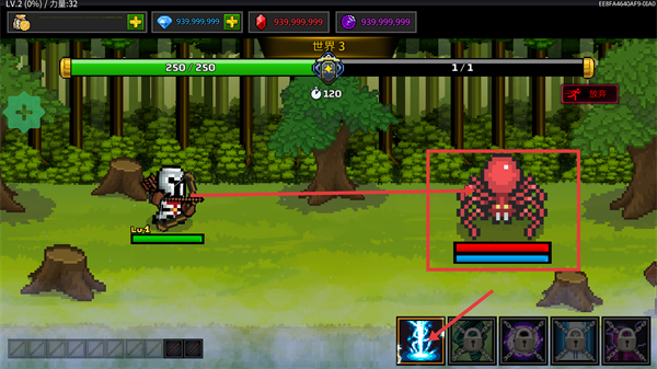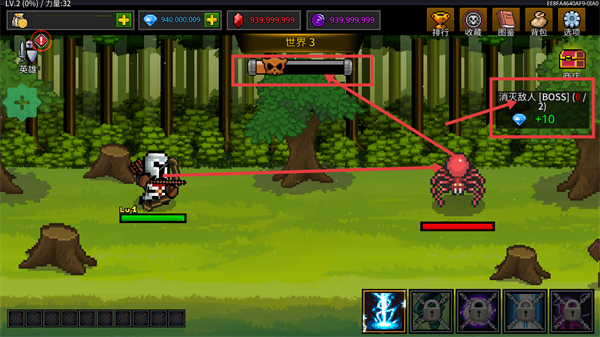 1、处于【世界3】,针对【消灭敌人-[BOSS]-(0/2)】的目标,操控【力量-32】的角色攻击对应BOSS,推进顶部带骷髅头的进度条。
