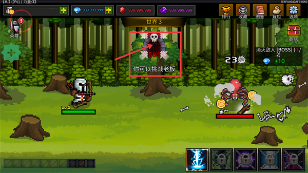 2、在【世界3】击败怪物后,触发【你可以挑战老板】的提示,此时可准备挑战BOSS,同时拾取掉落的资源道具积累物资。
