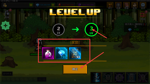 4、升级至【3-LV】后,领取【奖励】中的【SP+1】【钻石+50】等道具,点击【确定】按钮,继续强化角色能力。