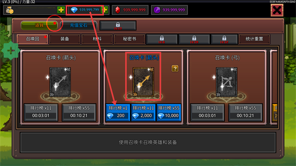 1、在道具界面,消耗【钻石-939,999,799】兑换【召唤卡(箭头)】,该卡可用于召唤英雄与装备,助力后续战力提升。
