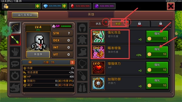 1、在冒险家等级界面,切换至【射箭】标签,消耗10金币强化【强化攻击】等技能,提升【力量-39】对应的战斗属性。