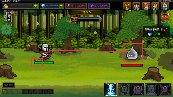 2、进入【世界5】,操控【LV.9】的角色攻击水滴状怪物,推进进度条的同时,积累资源完成【召唤回装备-(0/1)】的目标。