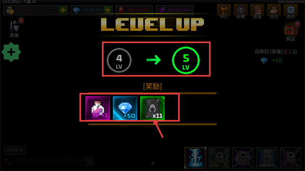 4、升级至【5-LV】后,领取【奖励】中的【SP+1】【钻石+50】等道具,继续强化角色的属性与战斗能力。