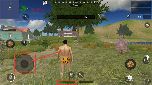 2、借助左下角移动轮盘控制角色移动,关注上方倒计时与小地图,探索场景区域,同时留意自身状态条的变化。