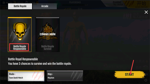 1、选择【Battle-Royal-Respawnable】模式,该模式提供3次生存机会,确认【Mode-Team-Death-Match】后点击【START】开启对局。