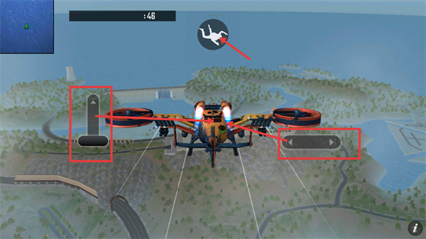 2、处于载具飞机内时,借助界面控制按钮调整位置,关注上方倒计时,准备执行跳伞操作以落地收集资源。