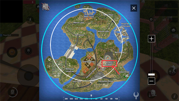 4、打开地图界面,选定【Almery-Castle】区域作为落点,结合地图标识规划跳伞路径,优先落地该区域收集物资。