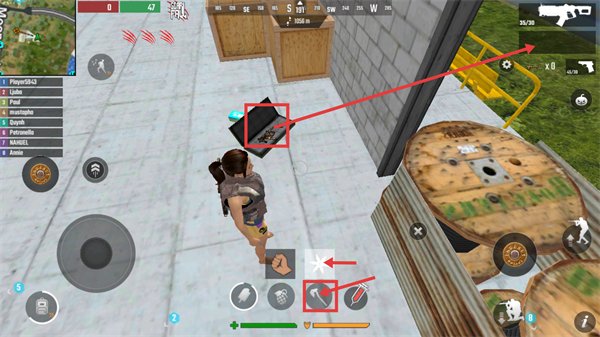 2、在建筑场景中,拾取箱子内物资,借助飞镖、斧头类道具提升战力,同步切换右上角武器栏装备。
