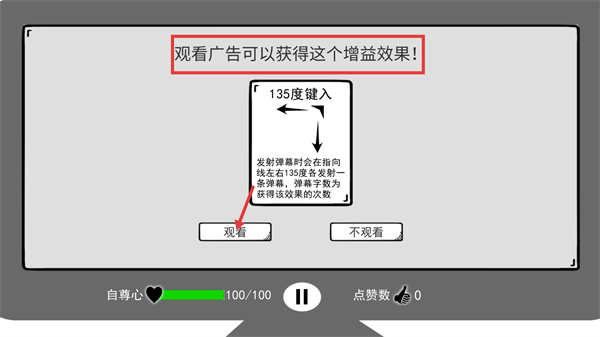 1、看广告可得“135度键入”增益(发射弹幕时会在指向线左右135度各加一条弹幕),可根据需求选择观看广告获取,或选“不观看”跳过。