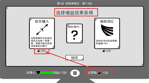 2、在视频弹幕区选增益需消耗对应点赞数,建议选适配当前关卡节奏的增益后点“继续”,留意自尊心与点赞数的实时变化。