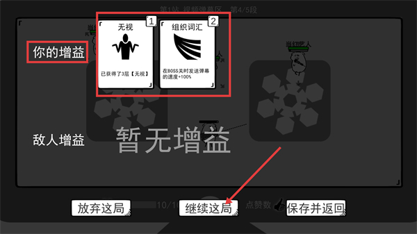 4、查看已得增益(如“无视”可抵伤、“组织词汇”提弹幕速度)后,点“继续这局”,借助这些效果推进关卡。