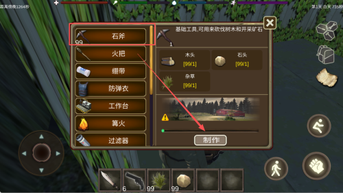4、制作工具:在物品栏中,使用收集到的资源制作生存工具,如石斧和火把。