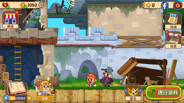1、界面含【商店】【任务】等功能,持有【1050】金币,点击【进行游戏】按钮,即可开启【查克】的挖矿资源收集进程。