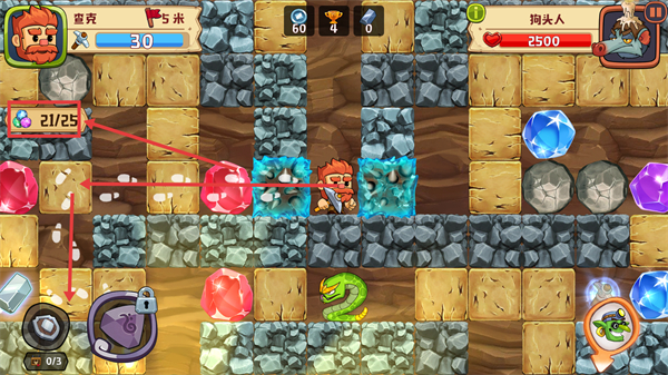 2、操控【查克】在5米矿洞挖掘,宝石进度【21/25】,镐子耐久【30】,同时留意【狗头人】敌人,持续开采宝石推进进度。