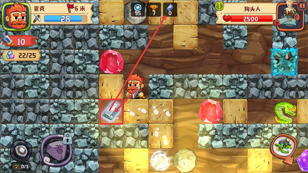 3、矿洞深度达6米,宝石进度【22/25】,镐子耐久变为【28】,收集道具后奖杯数升至7,继续开采推进资源收集。