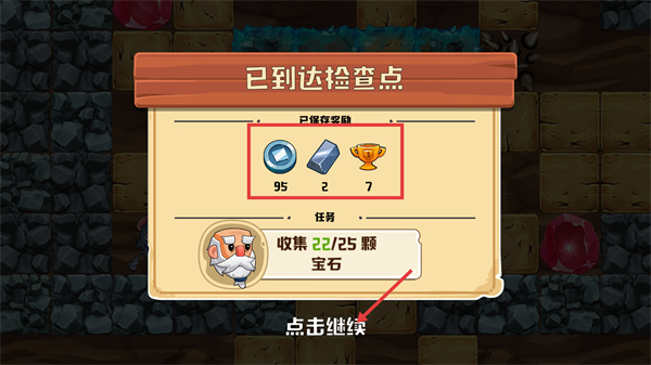 4、到达【检查点】,获得【95】金币等保存奖励,当前宝石收集【22/25】,点击【点击继续】可推进后续挖矿进程。