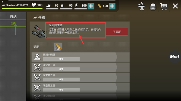 1、接取【找到抗生素】任务,因哈雷被变异人咬后感染,需前往营地附近碉堡获取,需先完成【找到小碉堡-0/1】等前置步骤推进流程。
