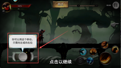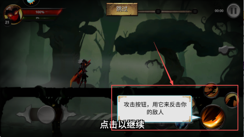 4、完成任务:击败所有敌人后,点击“点击以继续”按钮完成关卡。