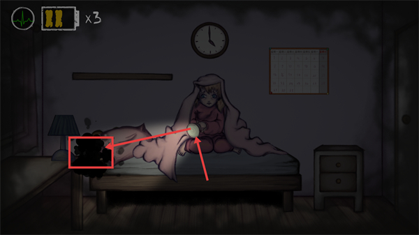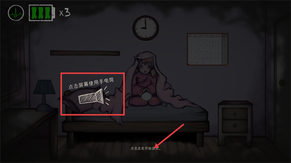 1、进入场景后先点击屏幕使用【手电筒】,留意左上角【3个-绿色电池】道具,再点击指定区域开始游戏,为后续应对场景做准备。