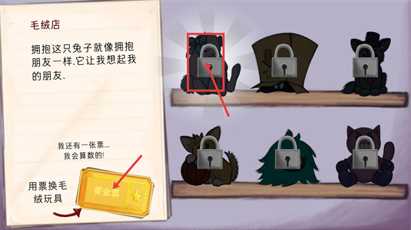 4、进入【毛绒店】界面后,可使用获得的【黄金票】兑换对应毛绒玩具,当前部分玩具处于锁定状态,需后续解锁条件达成。