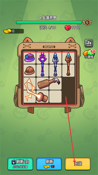 1、处于【失落荒野-波次4/10】背包界面,整理法杖类装备与攻击道具,确认搭配后点击【开战】,开启该波关卡挑战。