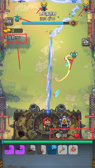 2、在【失落荒野-波次4/10】战斗中,关注【杀敌数-96】与【生命值-1162】,借助技能持续攻击敌人,稳固输出节奏。