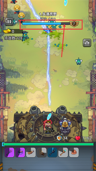 3、推进【失落荒野-波次4/10】战斗,【杀敌数-128】提升且防御升至34,持续利用装备技能清敌,推进波次进度。
