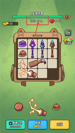 4、进入【失落荒野-波次5/10】背包界面,持有【金币-20】,整理现有装备后点击【开战】,挑战下一波敌人。