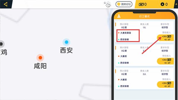 2、进入【打工模式】后,选择【大唐芙蓉园-西安鼓楼】订单,8公里的经济型订单可获得260收入+8XP,优先接匹配车型的订单。
