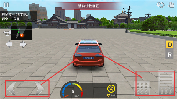 3、接单后进入驾驶界面,通过方向键操控车辆,留意剩余1时59分的时间与8公里距离,用D档前进前往载客区。