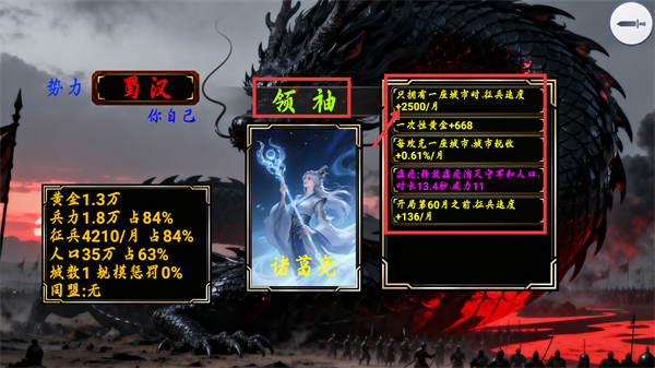1、选择【蜀汉】势力,依托领袖【诸葛亮】的加成,关注【黄金-1.3万】【兵力-1.8万】等资源数据。