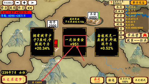 2、在地图界面获取【一次性黄金-+951】的收益,关注【长安-6000】【街亭-2500】的城池兵力,同时利用守城战力加成提升防御。