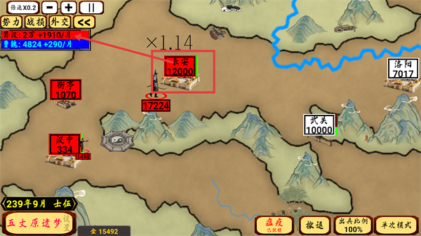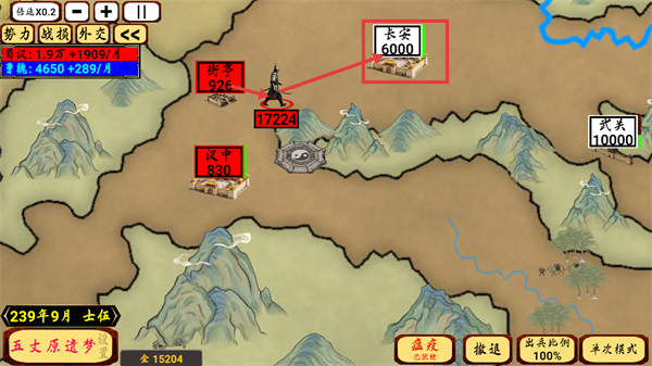 3、调遣【17224】兵力向【长安-6000】推进,同步留意【街亭-926】【汉中-830】的城池兵力状态,保障推进的兵力支撑。