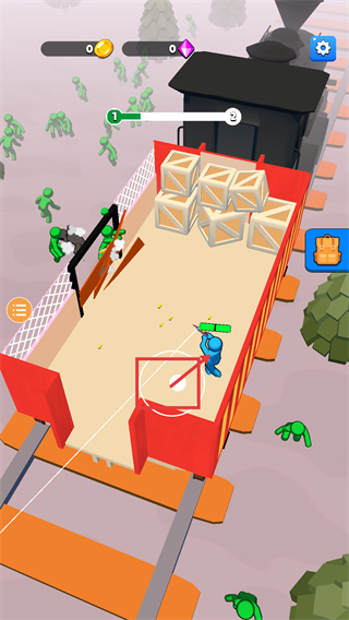 1、进入游戏后,操控蓝色角色瞄准车厢外的绿色敌人射击,推进等级进度(当前为1→2阶段),同时收集场景内的金币资源。
