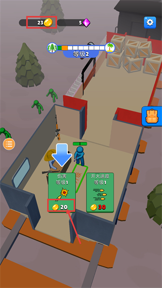 2、等级提升至2级后,消耗20金币升级【伤害等级1】属性,优先强化输出能力,也可选择消耗30金币升级【开火速度】来提升攻击频率。