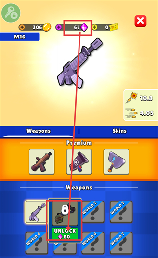 2、解锁【M16】需消耗60资源,可在【Weapons】栏查看该装备,同时留意【Premium】与【Skins】板块,按需解锁对应内容提升战力。