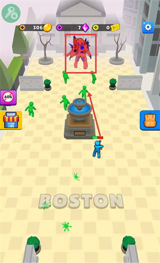 3、在【BOSTON】场景中,操控角色借助装置应对红色怪物,召集绿色小人协作,注意场景内的互动点来提升作战效率。