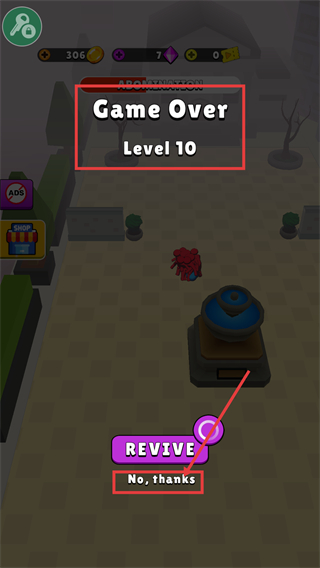 4、遭遇【Game-Over】(对应【Level-10】)时,可选择【REVIVE】恢复进程,若暂不复活则点击No,-thanks退出当前界面。