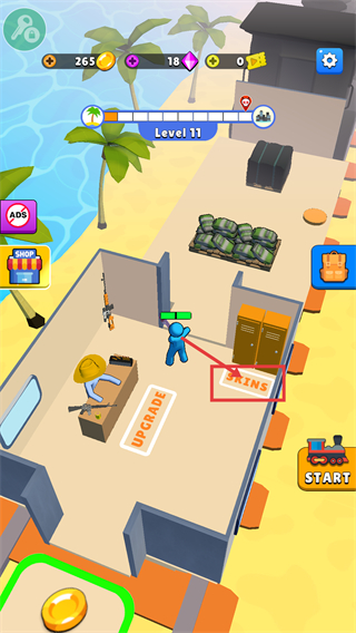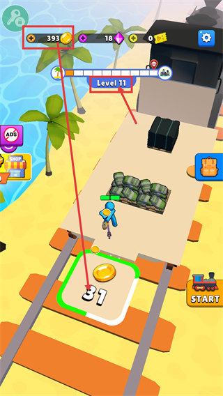 1、处于【Level-11】时,收集场地内的金币可提升当前393-金币的数值,留意界面的【START】按钮,完成准备后推进关卡进程。