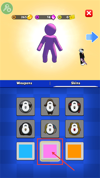 3、进入【Skins】界面后,可选用已解锁的颜色样式更换角色外观,未解锁样式需达成条件开启,丰富角色的展示效果。