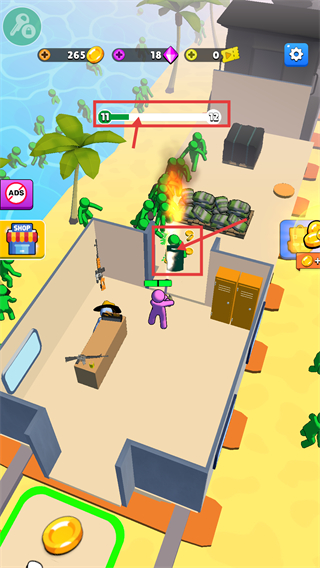 4、战斗中击败绿色小人可获取金币,关注界面11-12的进度条变化,积累进度来推进当前关卡的相关进程。