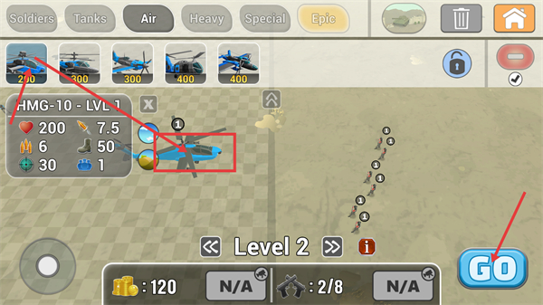 1、处于【Level-2】时,选用花费200的【HMG-10-LVL-1】直升机,查看其属性后点击【GO】按钮开启当前关卡的战斗。