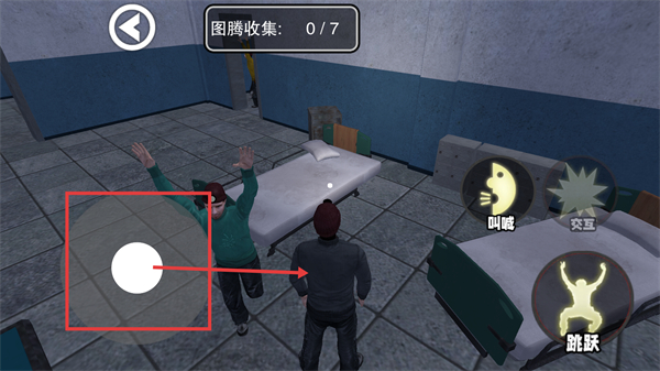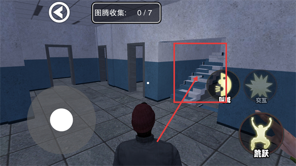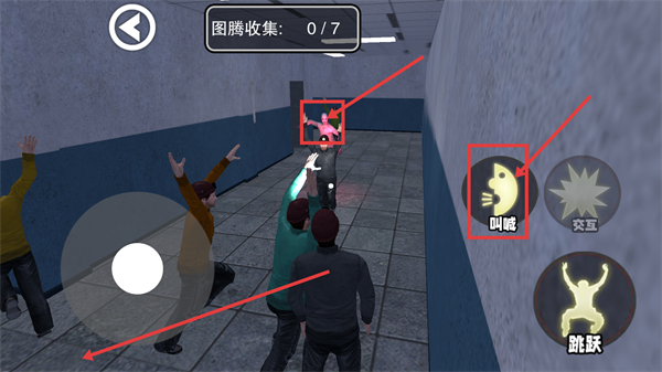 1、在当前场景中,利用移动按钮操控角色,留意【图腾收集-0/7】进度,借助【叫喊】【交互】【跳跃】功能推进图腾收集进程。