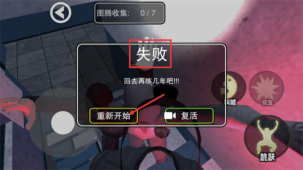 4、遭遇关卡失败时,选择【重新开始】按钮重启挑战,调整行动策略,以完成【图腾收集-0/7】的目标。