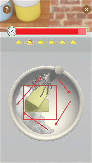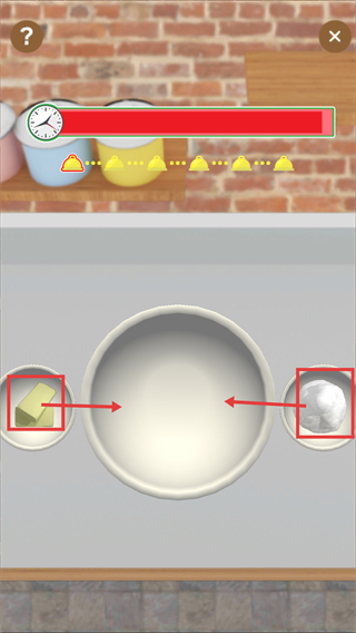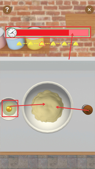 1、将【黄油】与【面粉】加入碗中,留意顶部进度条与铃铛提示,按步骤推进食材混合的初期流程。