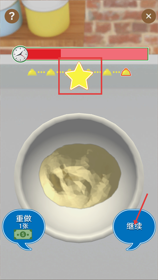 4、食材调制完成后获得星级评价,可选择【继续】推进后续流程,或消耗资源选【重做】优化制作。
