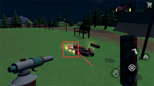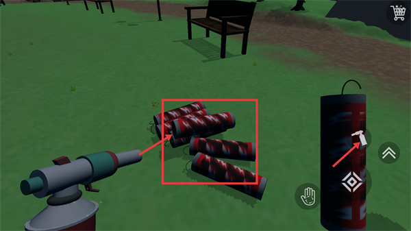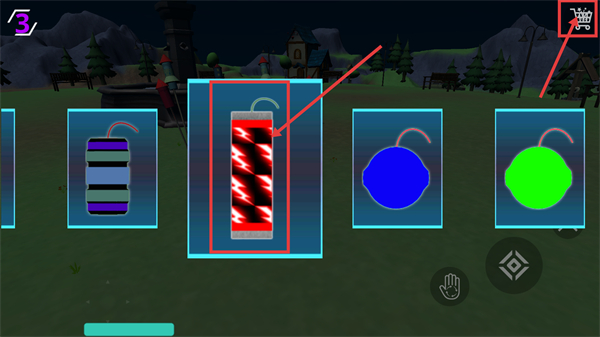 1、在道具选择界面选定红色炸药道具,留意右上角【购物车】功能,完成选择以推进后续的燃放相关操作。
